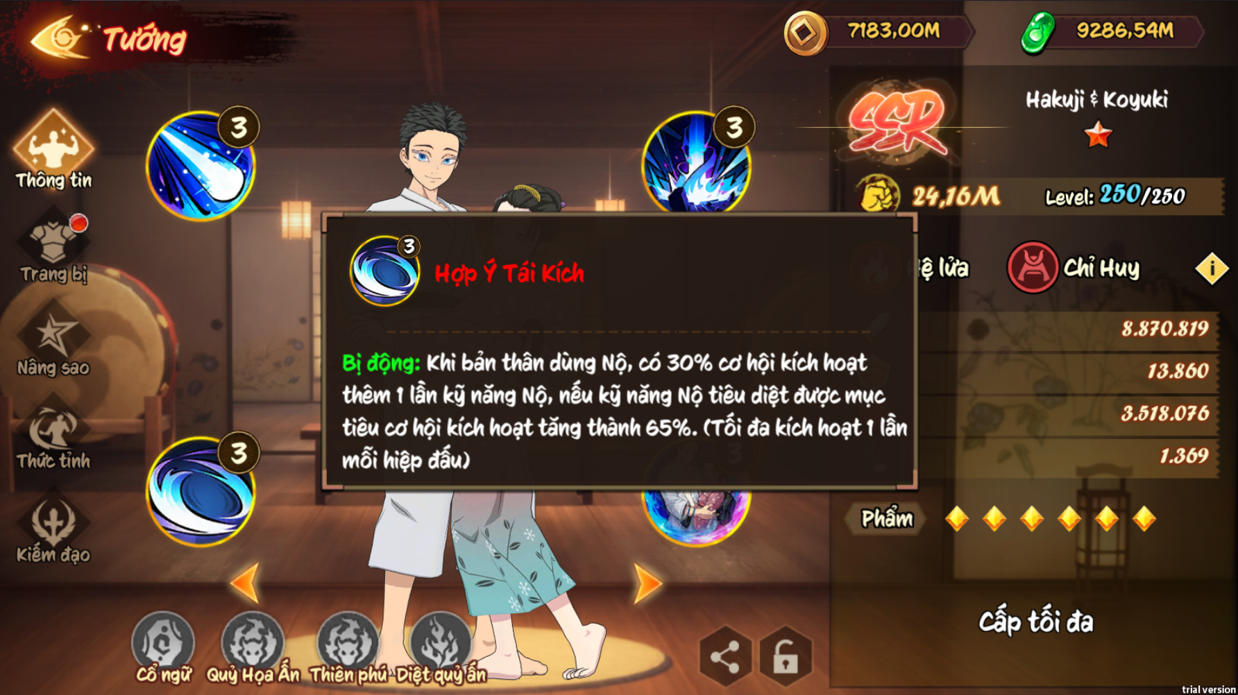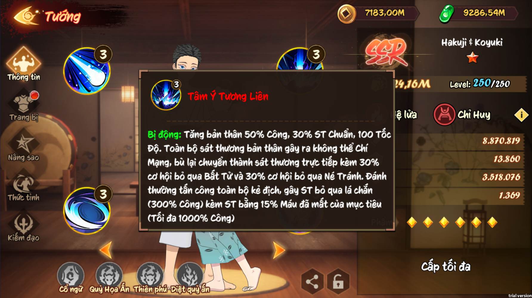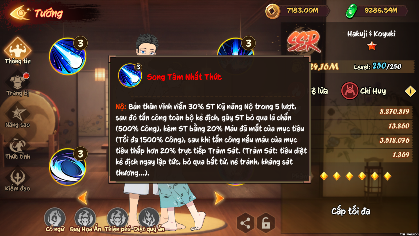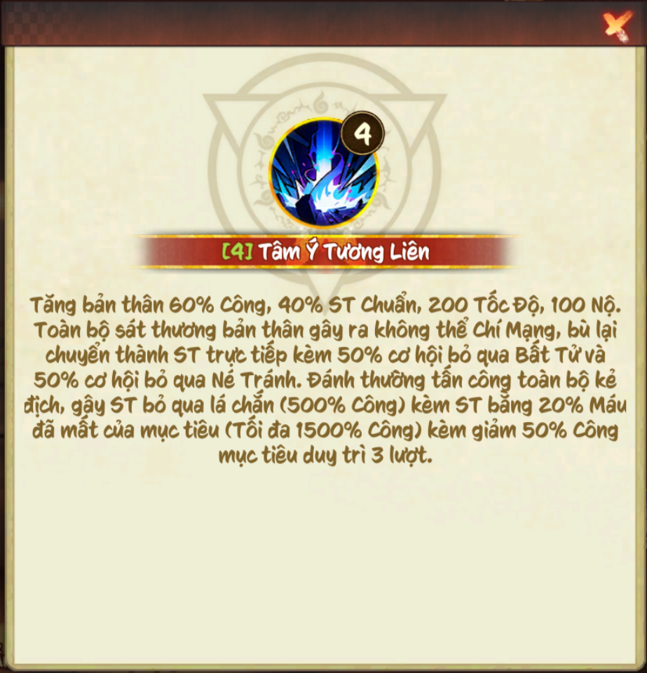 Bản thân vĩnh viễn 30% ST Kỹ năng Nộ trong 5 lượt, sau đó tấn công toàn bộ kẻ địch, gây ST bỏ qua lá chắn (500% Công), kèm ST bằng 20% Máu đã mất của mục tiêu (Tối đa 1500% Công), sau khi tấn công nếu máu của mục tiêu thấp hơn 20% trực tiếp Trảm Sát. (Trảm Sát: tiêu diệt kẻ địch ngay lập tức, bỏ qua bất tử, né tránh, kháng sát thương...).