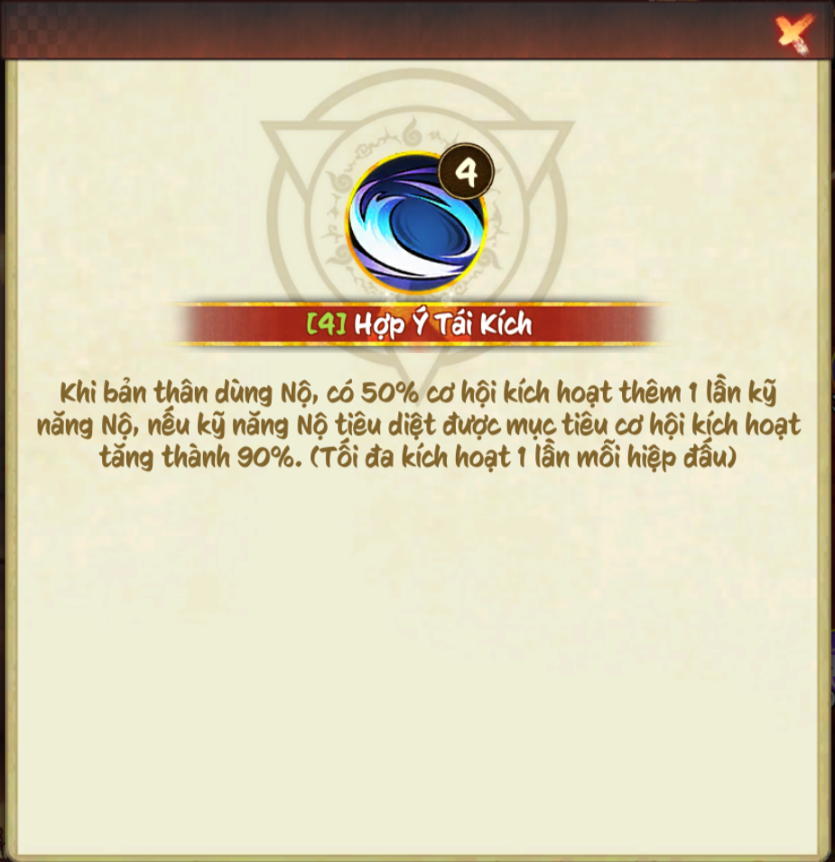 Khi bản thân dùng Nộ, có 30% cơ hội kích hoạt thêm 1 lần kỹ năng Nộ, nếu kỹ năng Nộ tiêu diệt được mục tiêu cơ hội kích hoạt tăng thành 65%. (Tối đa kích hoạt 1 lần mỗi hiệp đấu).