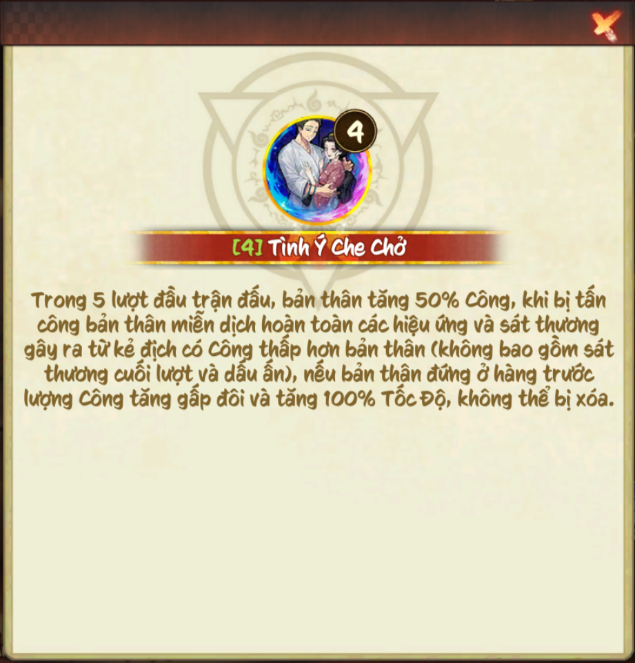 Trong 3 lượt đầu trận đấu, bản thân tăng 30% Công, khi bị tấn công miễn dịch hoàn toàn các hiệu ứng và sát thương gây ra từ kẻ địch có Công thấp hơn bản thân (không bao gồm sát thương cuối lượt và dấu ấn), nếu bản thân đứng ở hàng trước lượng Công tăng gấp đôi và tăng 50% Tốc Độ, không thể bị xóa.