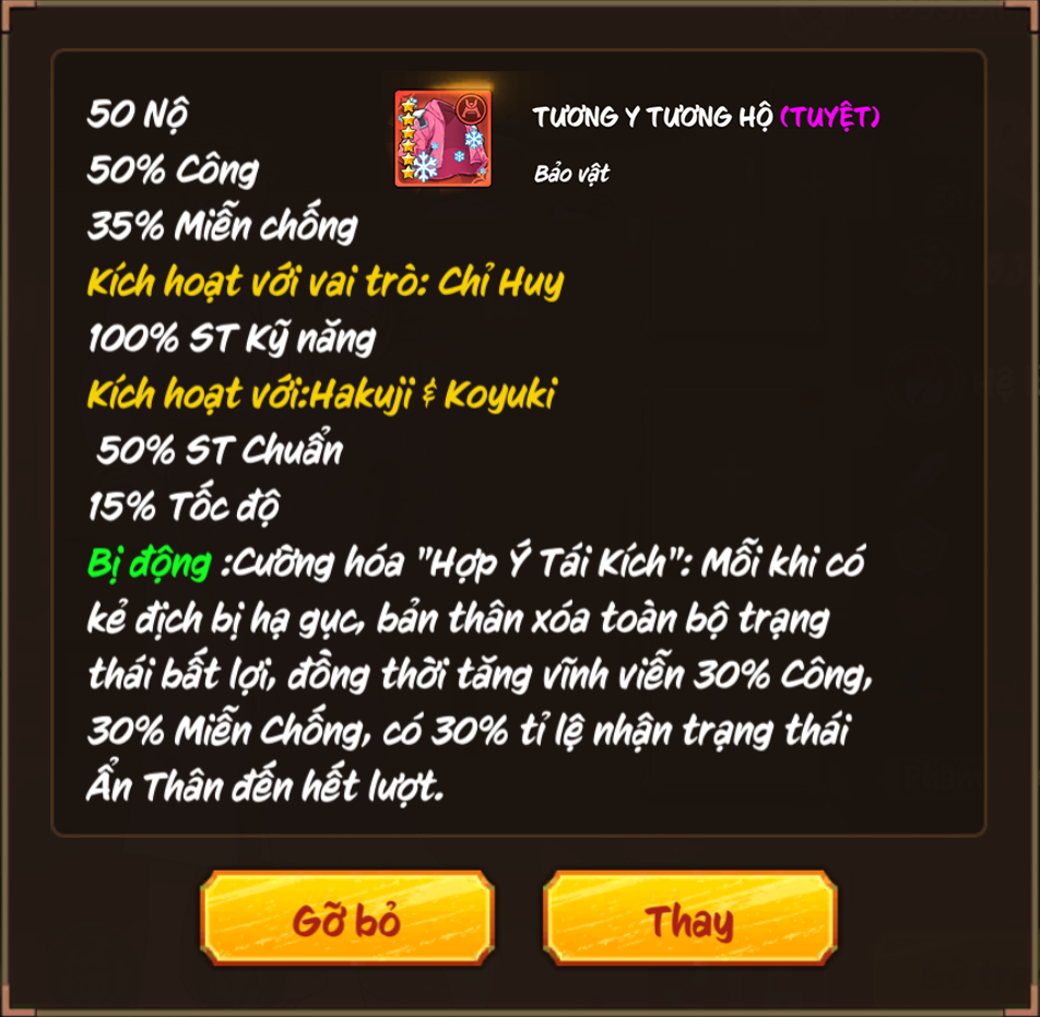 Tăng bản thân 50% Công, 30% ST Chuẩn, 100 Tốc Độ. Toàn bộ sát thương bản thân gây ra không thể Chí Mạng, bù lại chuyển thành sát thương trực tiếp kèm 30% cơ hội bỏ qua Bất Tử và 30% cơ hội bỏ qua Né Tránh. Đánh thường tấn công toàn bộ kẻ địch, gây ST bỏ qua lá chắn (300% Công) kèm ST bằng 15% Máu đã mất của mục tiêu (Tối đa 1000% Công).