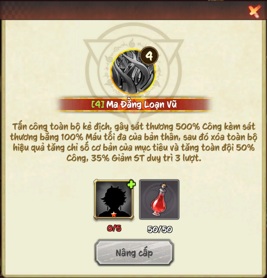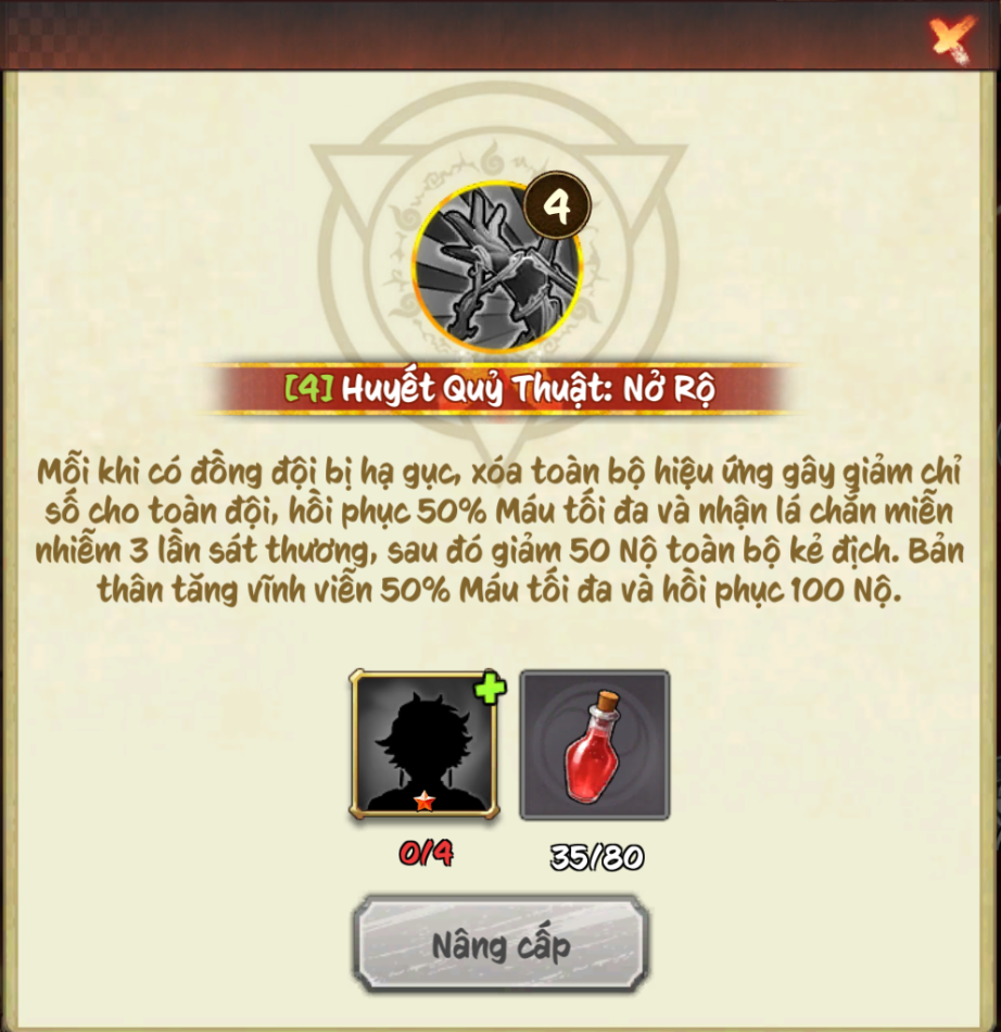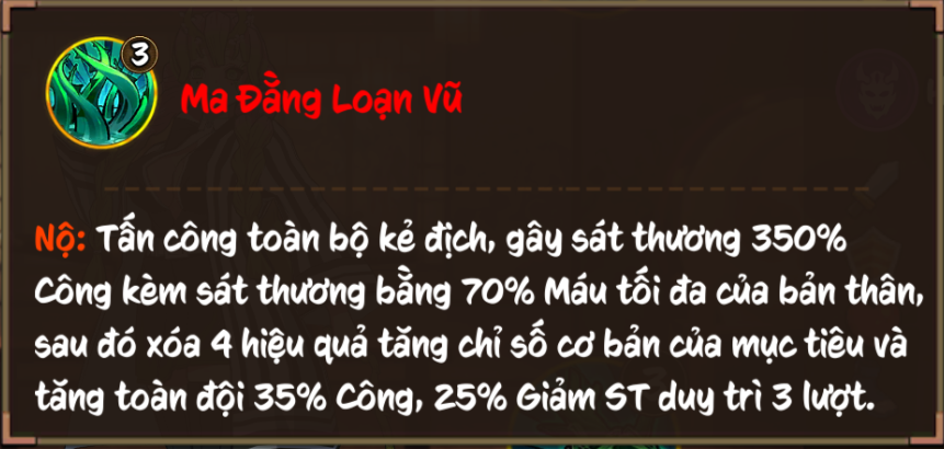 Nộ: Tấn công toàn bộ kẻ địch, gây sát thương 350% Công kèm sát thương bằng 70% Máu tối đa của bản thân, sau đó xóa 4 hiệu quả tăng chỉ số cơ bản của mục tiêu và tăng toàn đội 35% Công, 25% Giảm ST duy trì 3 lượt.