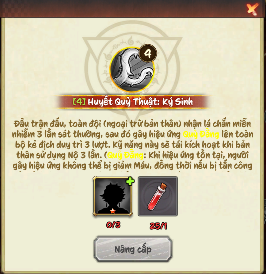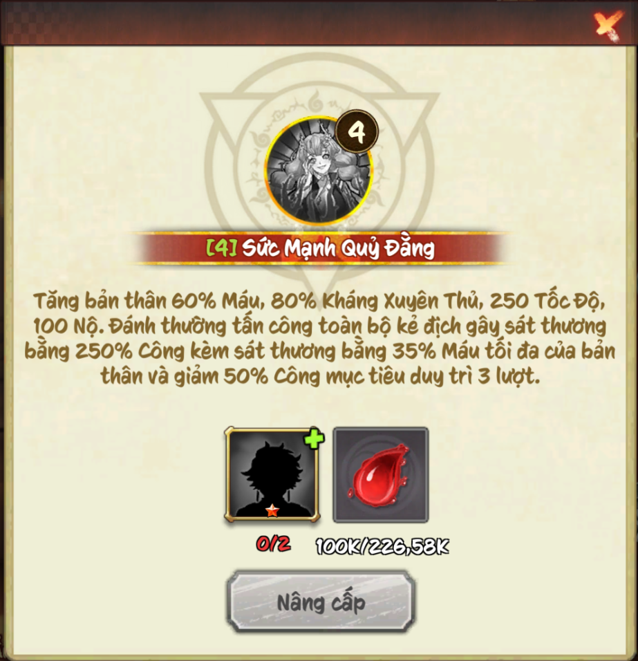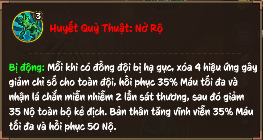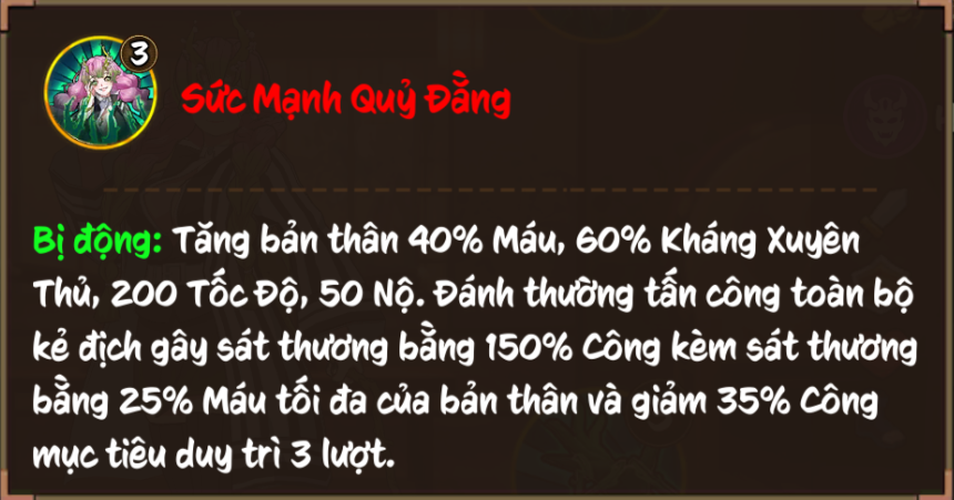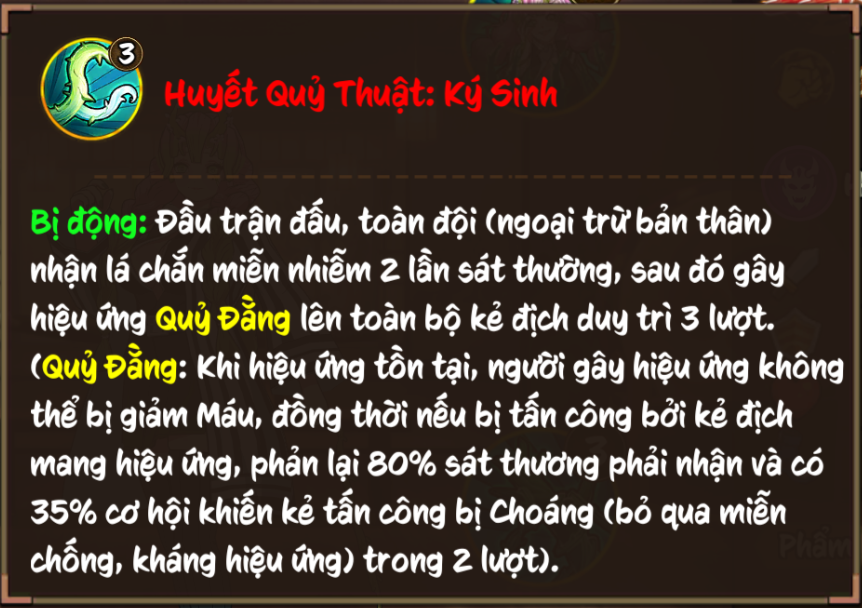 (Quỷ Đẳng: Khi hiệu ứng tồn tại, người gây hiệu ứng không thể bị giảm Máu, đồng thời nếu bị tấn công bởi kẻ địch mang hiệu ứng, phản lại 80% sát thương phải nhận và có 35% cơ hội khiến kẻ tấn công bị Choáng (bỏ qua miễn khống, kháng hiệu ứng) trong 2 lượt).
