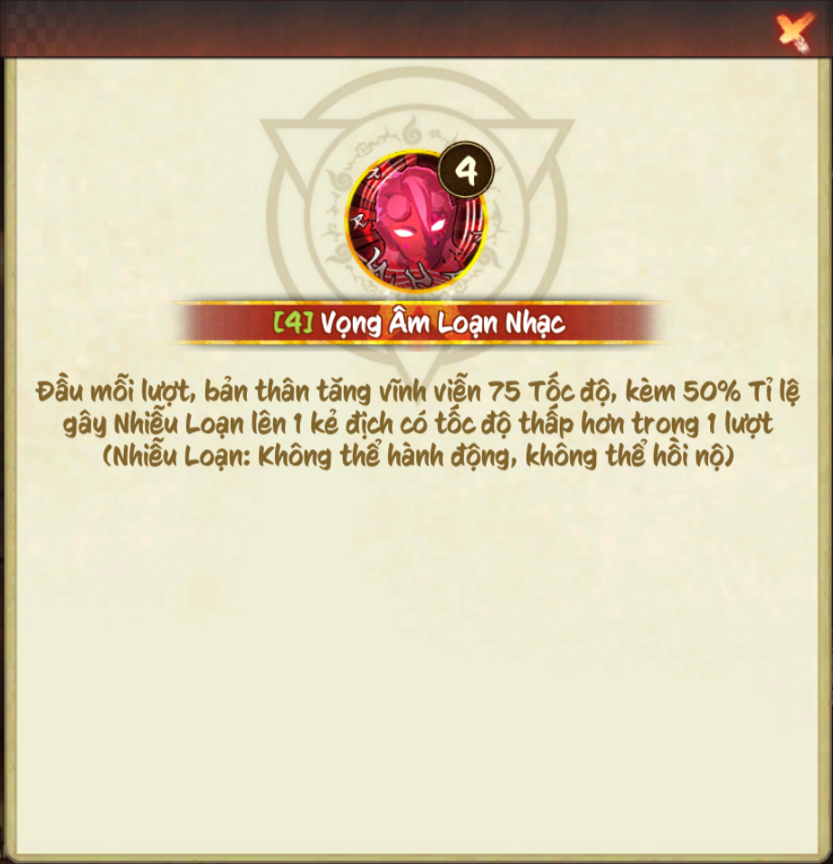 Đầu mỗi lượt, bản th6n 50 Tốc độ trong 3 lượt, kèm 30% tỉ lệ gây Nhiễu Loạn lên 1 kẻ địch có tốc độ thấp hơn trong 1 lượt (Nhiễu Loạn: không thể hành động, không thể hồi nộ)