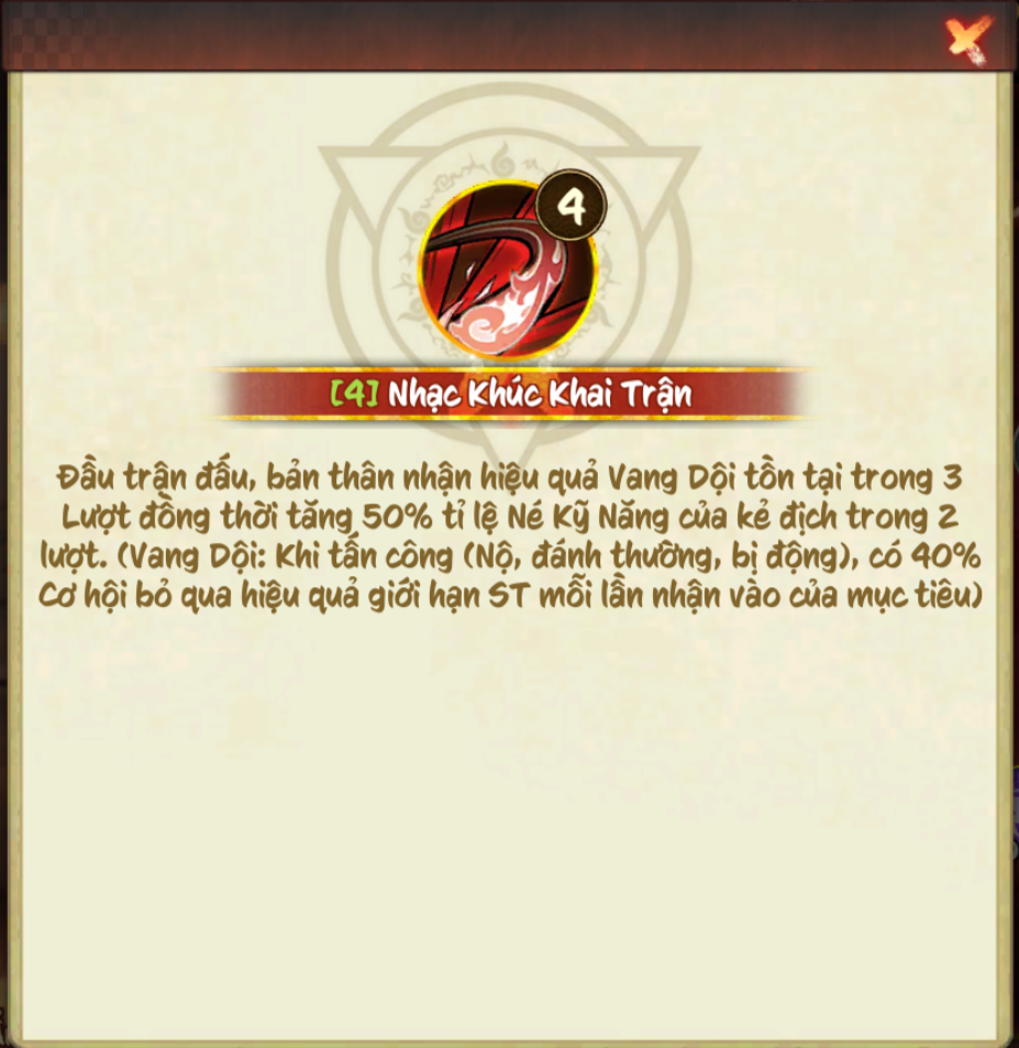 Đầu trận đấu, bản thân nhận hiệu quả Vang Dội tồn tại trong 2 lượt, đồng thời tăng 30% tỉ lệ né kỹ năng của kẻ địch trong 2 lượt. (Vang Dội: khi tấn công (nộ, đánh thường, bị động), có 20% cơ hội bỏ qua hiệu quả giới hạn st mỗi lần nhận vào của mục tiêu