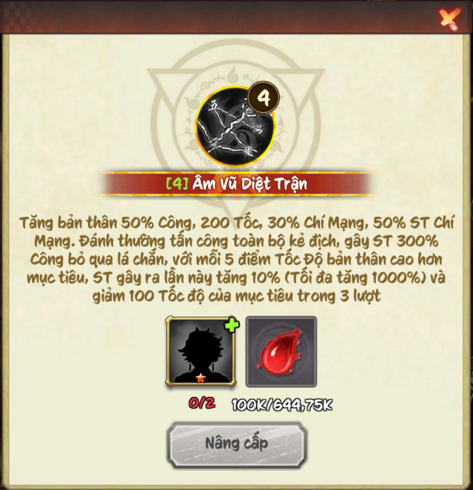 Nộ: mỗi lần kích hoạt kĩ năng nộ, tăng st gây ra bởi kỹ năng nộ trong 3 lượt vào lần kích hoạt tiếp theo. Tấn công toàn bộ kẻ địch, gây st công, với mỗi điểm tốc độ bản thân cao hơn mục tiêu, sát thương gây ra lần này tăng và có cơ hội giảm 25 nộ của mục tiêu
