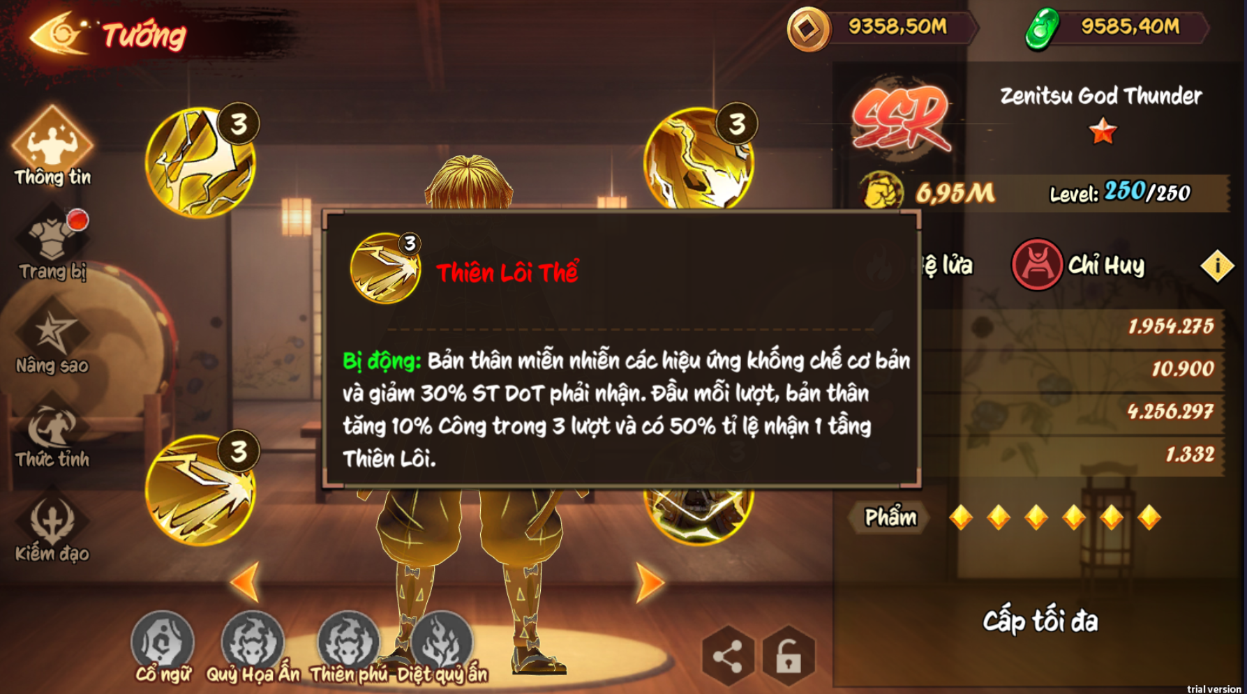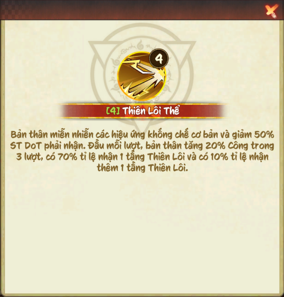 Bản thân miễn nhiễm các hiệu ứng khống chế cơ bản và giảm 30% T Dot phải nhận. Đầu mỗi lượt, bản thân tăng 10% công trỏng lượt và có 50% tỉ lệ nhận 1 tầng Thiên Lôi