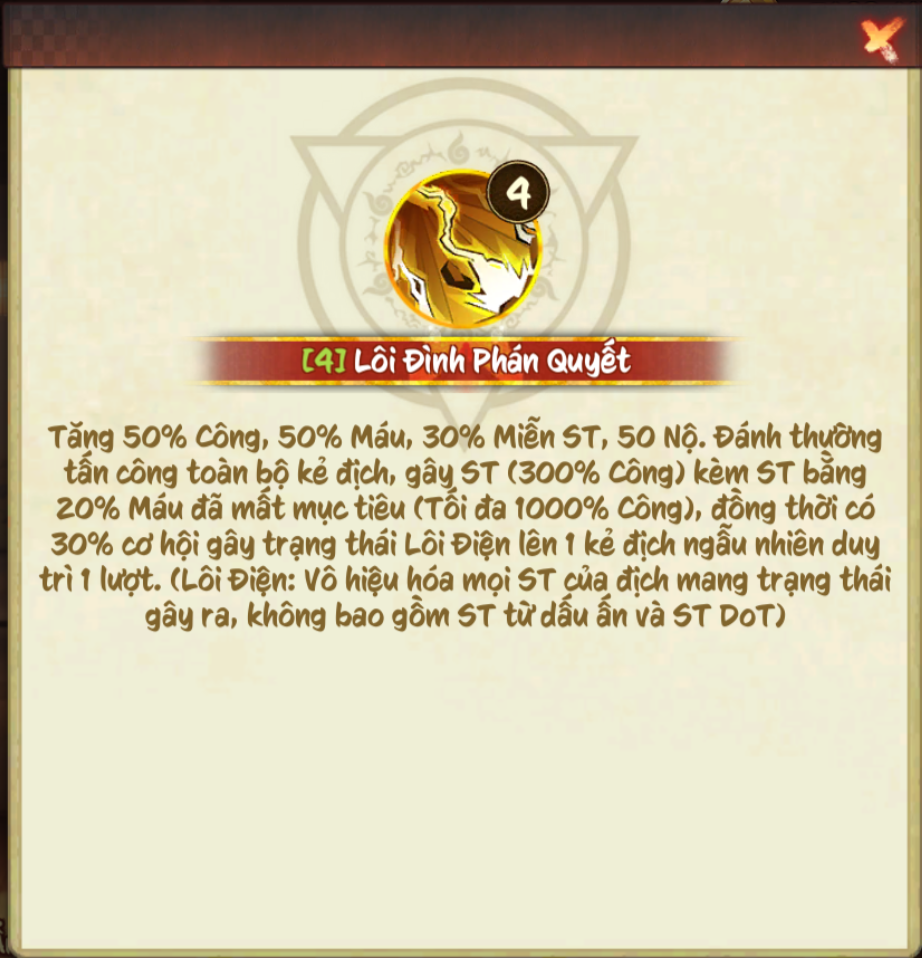 Tăng Công, Máu, Miễn ST. Đánh thường tấn công 3 kẻ địch ngẫu nhiên, gây ST (200% Công) kèm ST bằng 15% máu đã mất mục tiêu (tối đa 500% công), đồng thời có 15% cơ hội gây trạng thái Lôi Điện lên 1 kẻ địch ngẫu nhiên duy trì 1 lượt. (Lôi Điện: vô hiệu hóa mọi ST của địch mang trạng thái gây ra, không bao gồm ST từ dấu ấn và ST Dot)