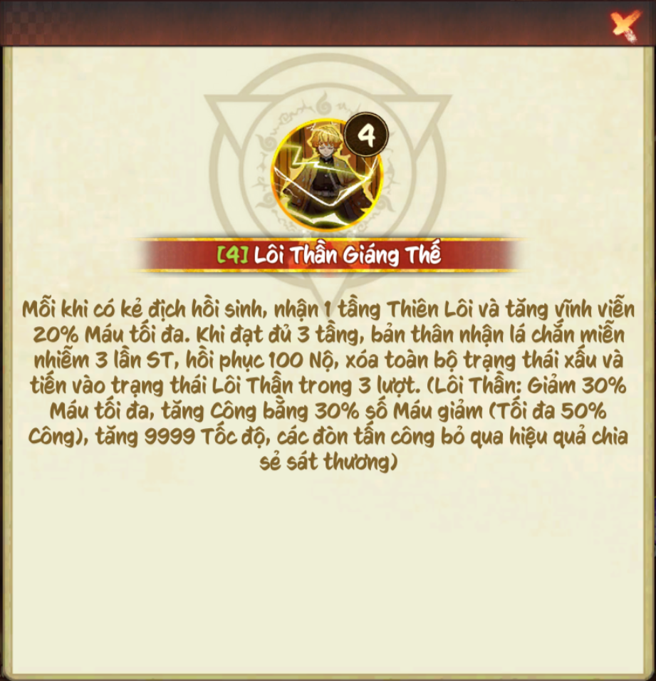 Mỗi khi có kẻ địch hồi sinh, nhận 1 tầng Thiên Lôi. Khi đạt đủ 3 tầng, bản thân nhận lá chắn miễn nhiễm 2 lần ST, xóa toàn bộ trạng thái xấu và tiến vào trạng thái Lôi Thần trong 3 lượt. (Lôi Thần: giảm 30% máu tôi đa, tăng công bằng 10% số máu giảm (tối đa 50% Công), các dòn tấn công có 70% tỉ lệ bỏ qua hiệu quả chia sẻ sát thương)