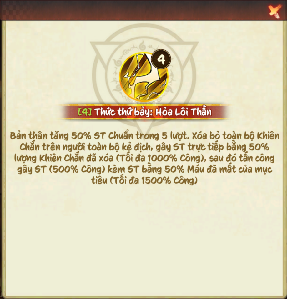 Xóa bỏ toàn bộ Khiên Chắn trên người toàn bộ kẻ địch, gây ST trực tiếp bằng 30% lượng Khiên Chắn đã xóa (Tối đa 500% Công), sau đó tấn công gây ST (300% Công) kèm ST bằng 30% máu đã mất của mục tiêu (tối đa 1000% Công)