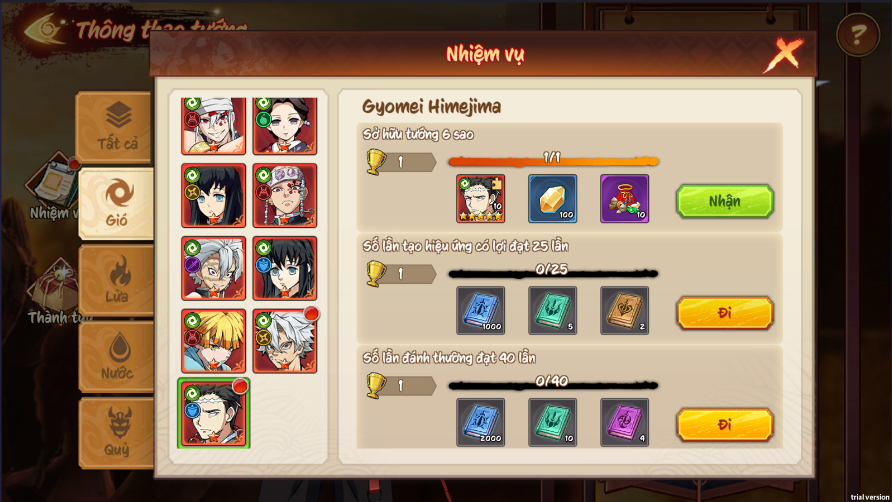 - Mỗi tướng có danh sách nhiệm vụ riêng biệt, sử dụng tướng tương ứng tham gia để hoàn thành nhiệm vụ